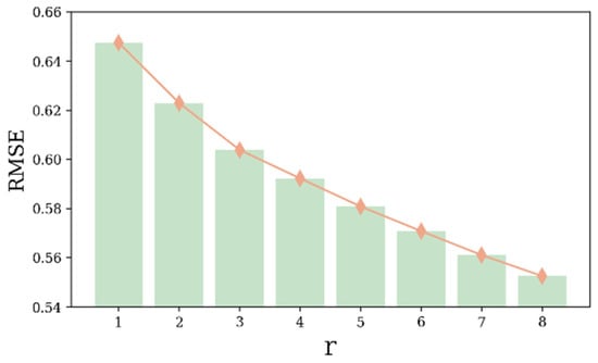 After constructing the tensor, the third-order tensor is subjected to CP decomposition. First, the rank r of the decomposition needs to be determined, which determines the number of sub-tensors after decomposition. The root means square error (RMSE) after CP decomposition [40] can be calculated using Equation (2):