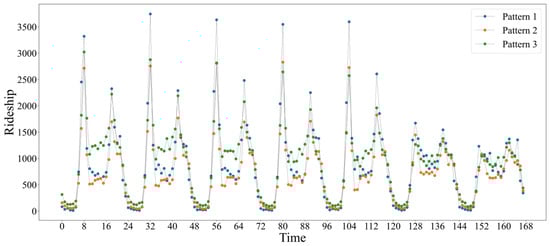 After determining the decomposition rank as 3, the constructed three-way tensor was decomposed using CP, resulting in three sub-tensors, each corresponding to a distinct pattern. Figure 5 shows the time distribution characteristics of three travel patterns, namely, pattern 1 with the highest travel volume during morning, evening, and night rush hours (peak-high traffic pattern), pattern 2 with relatively stable travel volume throughout the day (steady traffic pattern), and pattern 3 with the highest travel volume during off-peak hours (off-peak high traffic pattern).