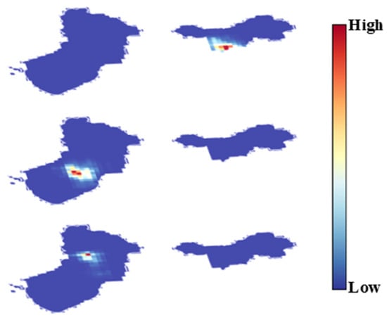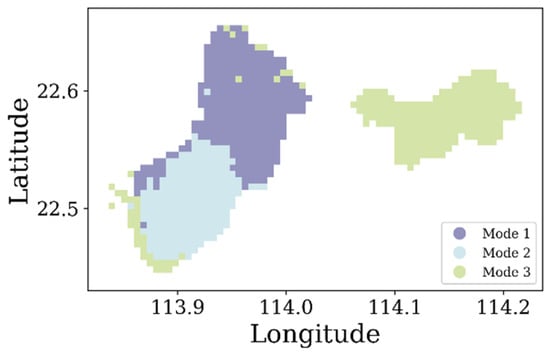 The spatial distribution characteristics of the three extracted travel patterns are visualized in Figure 6. It can be seen that in the peak-high traffic pattern, the travel volume is mainly concentrated in the northern part of Nanshan District, which is a hub for high-tech industries in Shenzhen. In the steady traffic pattern, the travel volume is mainly concentrated in the southern part of Nanshan District, which contains large residential areas, including residential complexes and commercial areas. In the off-peak high traffic pattern, the travel volume is mainly concentrated in the southern part of Luohu District, which has inland ports, transportation hubs, and tourist attractions. The distribution characteristics of travel volume correspond to the functions of urban building clusters. Based on the time and spatial feature distributions of the travel patterns, the 777 grids are divided into 299 grids for the peak-high traffic pattern, 216 for the steady traffic pattern, and 262 for the off-peak high traffic pattern, as shown in Figure 7. From the time-space characteristics, these three patterns represent three clusters of bike-sharing trips.