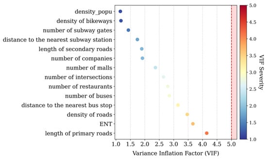 This study selects 13 built environment variables to investigate their influence on bike-sharing travel patterns, with variable selection grounded in three key principles: (1) alignment with 5D theory [42] of built environment dimensions, including density, diversity, design, destination accessibility, and distance to transit; (2) empirical validation through prior bicycle travel behavior studies, such as the influence of built environment features on bike-sharing ridership [43], effects of built environment and weather on bike sharing demand [44], and nonlinear and threshold effects of the built environment on dockless bike-sharing [45]; and (3) elimination of multicollinearity via variance inflation factor (VIF) screening [46]. Figure 8 shows the VIF values of the 13 selected built environment factors. They are all less than the threshold value of 5, so there is no significant multicollinearity between the feature variables.