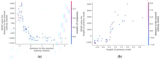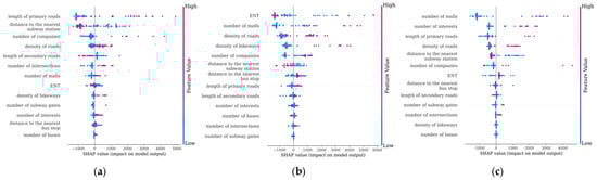 SHAP is used to interpret the model and rank the importance of features based on their contribution to the model output. For the peak-high traffic pattern, Figure 9a shows that the length of the primary roads has the greatest impact on bike-sharing usage, with the influence increasing as the road length increases. This suggests that users are more inclined to ride shared bikes along primary roads rather than on other roads, as longer primary roads offer more accessibility and convenience, making shared bikes the preferred pattern of travel. Additionally, the distance to the nearest subway station has a significant impact, with a greater influence as the distance decreases, indicating that shared bikes are largely used in conjunction with the subway. On the other hand, the distance to the nearest bus stop has a smaller impact, suggesting that shared bike users prefer the subway over buses in public transportation. The number of companies is also a significant factor promoting shared bike usage, concentrating on travel demand, particularly during peak commuting hours.