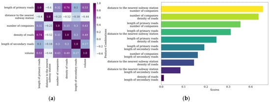 After analyzing the importance of individual features, this study further investigates the impact of different feature combinations on bike-sharing travel patterns. The top five features with the greatest impact on the peak-high traffic pattern are selected: length of the primary roads, distance to the nearest subway station, number of companies, density of roads, and length of the secondary roads. A heatmap of these feature relationships is shown in Figure 10a. The heatmap provides an intuitive understanding of the correlation between features and the relationship between features and target variables. In absolute value terms, the length of the primary roads exhibits the strongest positive correlation with the density of roads among all variables analyzed, the correlation between length of the primary roads and length of the secondary roads is the weakest, and the distance to the nearest subway station is negatively correlated with all other features or the target variable.