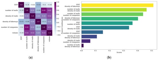The top five features with the greatest impact on the steady traffic pattern are selected: ENT, number of malls, density of roads, density of bikeways, and number of companies. A heatmap of these feature relationships is shown in Figure 12a. In absolute value terms, it is evident that the correlation between the number of malls and the number of companies is the strongest, the correlation between ENT and the density of bikeways is the weakest, and ENT is negatively correlated with all other features and the target variable.