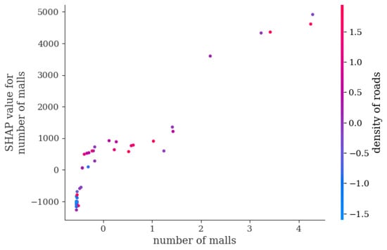 Figure 13 shows the interaction effect between these two features and the target variable, demonstrating that more malls and greater road density promote shared bike usage. The distribution of malls mainly consists of single large malls and clusters of more than three malls. For the steady traffic mode, mall clusters have a greater attraction for shared bikes, though this needs to be combined with infrastructure such as roads.