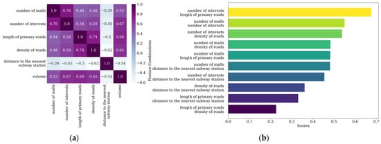 The top five features with the greatest impact on the off-peak high traffic pattern are selected: number of malls, number of interests, density of roads, length of the primary roads, and distance to the nearest subway station. A heatmap of these feature relationships is shown in Figure 14a. In absolute value terms, the correlation between the number of malls and the number of interests is the strongest, the correlation between the density of roads and the length of the primary roads is also strong, while the correlation between the number of malls and the distance to the nearest subway station is weaker.