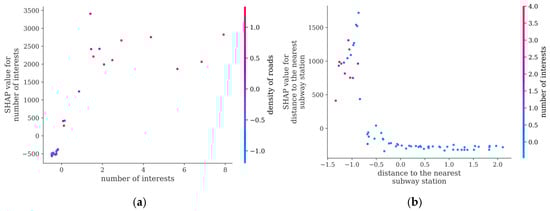 Figure 15a demonstrates a non-monotonic relationship, with the SHAP value peaking at two interest points, indicating maximal model sensitivity to this feature. Beyond this threshold, incremental additions progressively weaken the variable’s predictive influence, likely reflecting demand saturation effects that divert commuters to alternative transport modes. Figure 15b shows that the greater the number of attractions and the closer the subway station is, the more shared bikes are used.