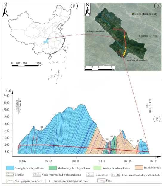 - Liu, N.; Pei, J.; Cao, C.; Liu, X.; Huang, Y.; Mei, G. Geological investigation and treatment measures against water inrush hazard in karst tunnels, A case study in Guiyang, southwest China. Tunn. Undergr. Space Technol. 2002, 124, 104491. [Google Scholar] [CrossRef]