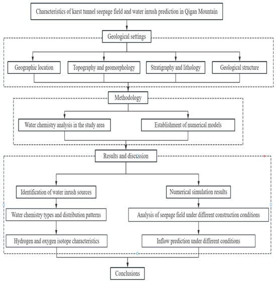 We conducted water chemistry analysis and numerical simulations at the tunnel site. Surface water and groundwater samples were collected using professional sampling equipment, and their fundamental chemical and isotope characteristics were tested in a water chemistry laboratory. Subsequently, a numerical model of the tunnel site was developed, using MODFLOW [32] to evaluate the seepage field. Figure 2 shows a flowchart of the applied methodologies in this study.
