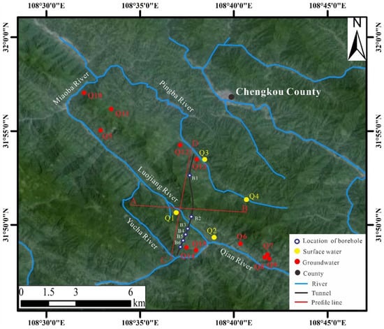 A field investigation was carried out on both the surface water and groundwater within the research area. Four surface water samples and eleven groundwater samples were collected. The groundwater samples were collected from springs and outlets of underground rivers. To ensure result accuracy, all the samples were collected in 500 mL polyethylene bottles, directly from field water sources, during this study [33]. During the laboratory analysis, all the water samples underwent comprehensive water chemistry and isotope analysis. The testing instruments used include: ICP-OES (Thermo Fisher ICAP 7200 Radial, Thermo Fisher, Waltham, MA, USA) for analyzing the elemental composition of the samples, ICS-2100 (Thermo Fisher, Waltham, MA, USA) for determining anions and cations in the water samples, a pH meter (PHSJ-4F, Shilei-ci, Shanghai, China) for measuring the pH levels of various water types, and a stable isotope ratio mass spectrometer (Nu Perspective Series, Nu Instruments, Wrexham, UK) for measuring the isotope ratios in the samples [33,34,35]. The precise locations of the sampling points are depicted in Figure 3.