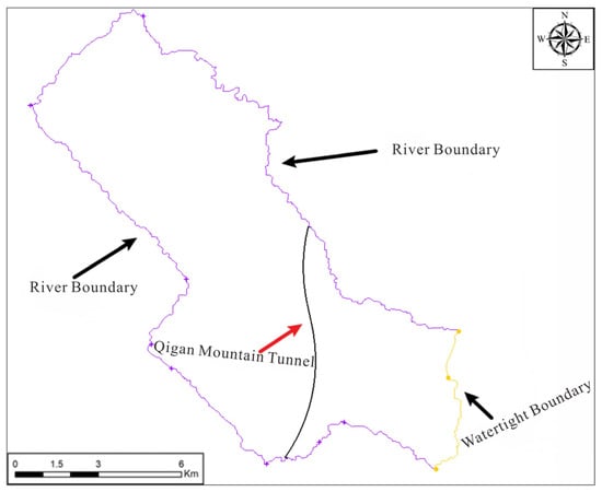 Establishing a hydrogeological model requires the boundary range to be defined including both the tunnel and the hydrogeological units affected by it, thereby ensuring the establishment of an independent hydrogeological system. When constructing the model, priority should be given to natural boundaries, such as surface water bodies, faults, and watersheds, as boundary conditions. Rivers, including the Pingba River, Miaoba River, Dongxi River, Yucha River, and Qian River, are identified as specified-head boundaries, based on their hydrogeological characteristics, with a small watershed in the southeast serving as a watertight boundary. The regional scope encompasses an area of 145.89 km2, with the model boundaries depicted in Figure 4.