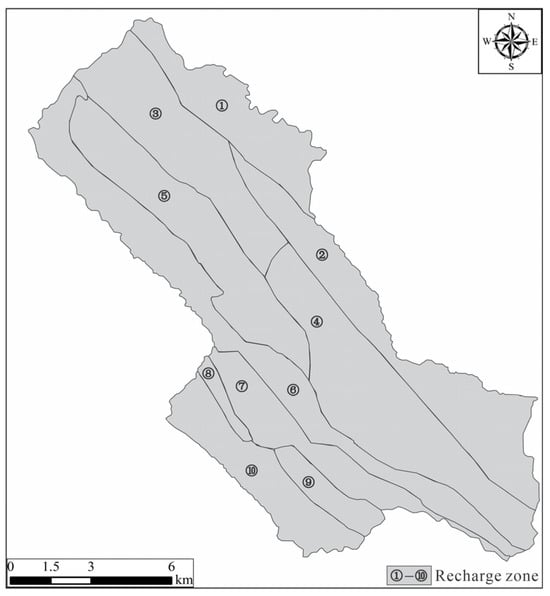 The subsequent hydrochemical analysis reveals that groundwater in the tunnel area is predominantly recharged by atmospheric precipitation. This model defines recharge by assigning infiltration coefficients to the top layer of the model and divides the study area into 10 infiltration recharge zones. These zones are delineated based on the collection of regional meteorological data and the division of hydrogeological units. The precipitation recharge zoning map of the study area is depicted in Figure 6. The specific infiltration coefficients for each zone were determined during the calibration process, based on the observation borehole water levels (Section 3.2.5), which are shown in Table 1.