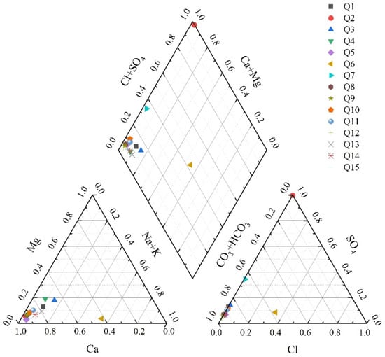 In this study, Q6, Q7, and Q2 exhibit different hydrochemical types, namely the Na–Ca–HCO3–Cl type, Ca–HCO3–SO4 type, and Ca–SO4 type, respectively. By integrating field sampling and analyzing regional hydrogeological features, Q6, which traverses a construction area during runoff, exhibits variations in its ion concentrations, which is attributed to external factors. Q7 represents water from fractured rocks, undergoing displacement reactions with rocks along the runoff pathway, particularly with sulfate-bearing minerals, resulting in notable alterations in its SO42− concentrations. Q2 is impacted by pollution from mining areas in the upstream region of the surface water, containing significant levels of Ca2+ and SO42− ions, thus defining its hydrochemical composition.