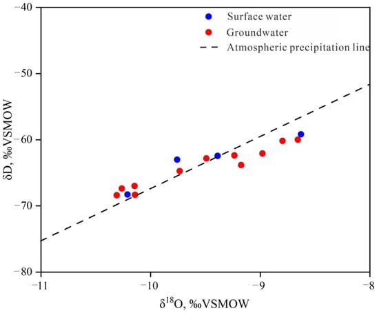 According to the test results, the δ18O values of the groundwater range from −10.31‰ to −8.66‰, with an average of −9.67‰; the δD values range from −68.4‰ to −60.2‰, with an average of −65.0‰. The δ18O values of the surface water range from −10.2‰ to −8.63‰, with an average of −9.26‰; the δD values range from −68.3‰ to −59.2‰, with an average of −64.4‰.