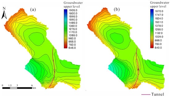The numerical simulation divides the regional seepage field into six layers, according to the strata, from top to bottom. Figure 9 illustrates the initial seepage field in the fourth layer, which the tunnel primarily passes through. In natural conditions, the maximum groundwater head in the area reaches 1920 m, while the minimum head is 630 m. Regional groundwater tends to converge towards rivers, resulting in significant fluctuations in the groundwater upper level, with a decreasing trend from high to low elevation areas.