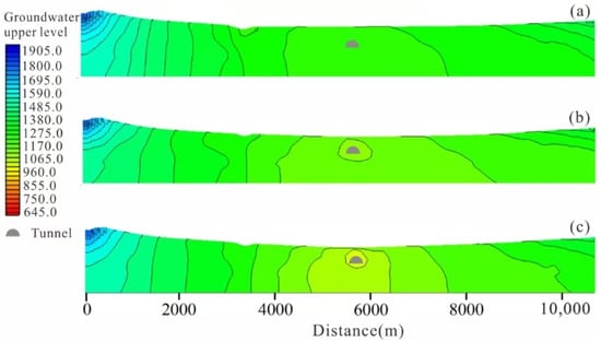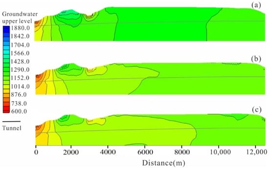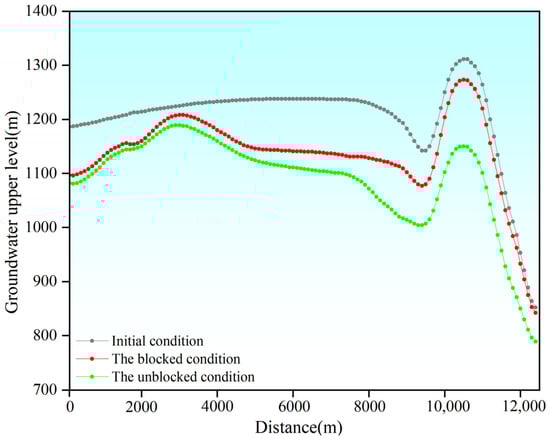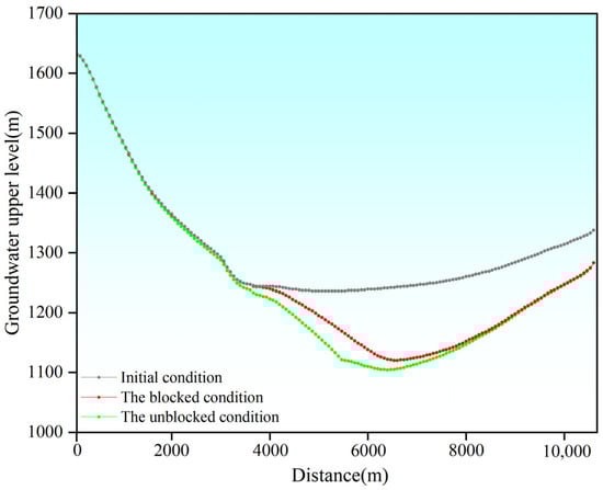 Profile C–D is positioned near the entire length of the tunnel. As depicted in Figure 14, it is evident that the seepage field of the entire profile will experience a significant impact and undergo considerable changes during tunnel excavation. Figure 15 shows the changes in the groundwater upper level along the C–D profile as tunnel excavation progresses. Initially, the groundwater upper level distribution within the profile showed lower values at the rightmost position and higher values elsewhere. With the progress of tunnel excavation, the overall groundwater upper level of the seepage field decreased, with a similar variation trend in the groundwater upper level. Under blocked conditions, the decrease in the groundwater upper level is about two-thirds of that under unblocked conditions. The maximum decrease in the groundwater upper level under blocked conditions is around 120 m and the lowest decrease in the groundwater upper level is about 50 m. While under unblocked conditions, the maximum decrease is around 160 m and the lowest decrease is about 100 m.