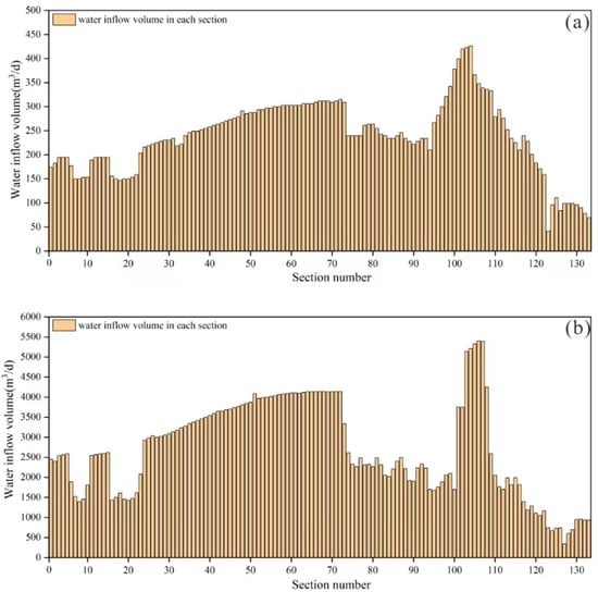 The numerical simulation calculates the water inflow for different conditions in various sections of the tunnel: (a) the blocked construction conditions; and (b) the unblocked construction conditions.