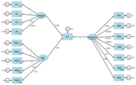 This method was also applied to previous studies regarding factors influencing entrepreneurial intention [125] and the measurement of entrepreneurial intention by applying the Theory of Planned Behavior [126]. The widespread adoption of this methodology is further explicable by the availability of diverse, readily accessible software platforms, which afford researchers efficient implementation of SEM [120].