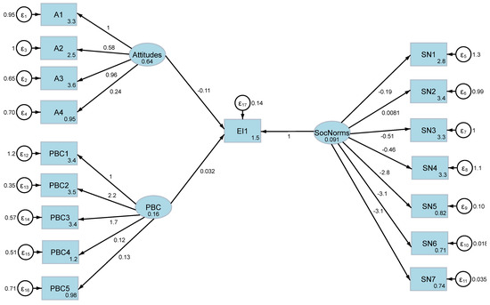 For each of the three dimensions of TPB, the observed variables were formulated based on previous relevant research. For attitudes, the perception of lacking a viable business idea is a critical inhibitor of entrepreneurial intention. When individuals do not perceive a feasible idea, it can lead to a negative attitude and diminish their entrepreneurial aspirations [90,102]. The absence of partners is another significant concern; partnerships can enhance resource sharing and support, which individuals often interpret as crucial for entrepreneurial success. Those who anticipate difficulties in finding suitable partners may develop negative attitudes, affecting their entrepreneurial intentions [103,104].