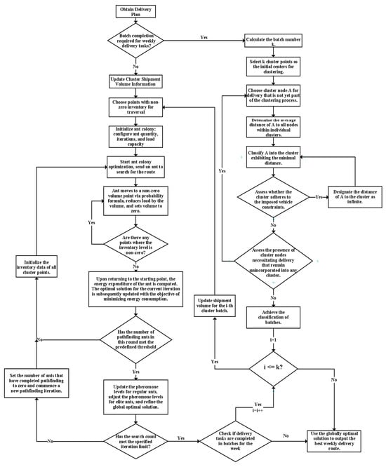 - Wang, Y.F. Implementation of multiple vehicle routing optimization system based on ant colony clustering algorithm. J. Hubei Univ. Natl. (Nat. Sci. Ed.) 2015, 33, 200–204+209. [Google Scholar]