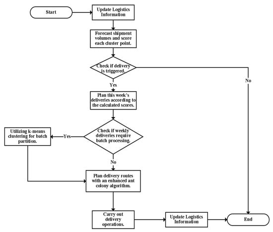 The remainder of this article is organized as follows. Section 2 reviews the relevant literature on low-carbon logistics and route optimization, focusing on the route optimization model considering carbon emissions and the corresponding heuristic algorithm. Section 3 introduces the establishment of the model, focusing on vehicle information, model assumptions, and the derivation process of the model, Section 4 introduces the optimization of the model, focusing on the scoring system delayed delivery strategy and improved ant colony algorithm, as well as the optimization flow chart, and Section 5 presents numerical experiments, validating the model’s effectiveness through comparative analysis. Finally, Section 6 concludes with findings, limitations, and future research directions. The technology roadmap of this article is shown in Figure A1 in Appendix A.
