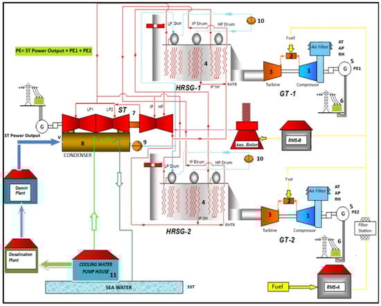 The CCPP examined in this study has an installed capacity of 950 MW and operates on both Brayton and Rankine cycles. There are two gas turbines and one steam turbine. First, atmospheric air passes through coarse and fine filtration, is compressed by the compressor (1), and then sent to the combustion chamber (2). Meanwhile, natural gas from the Regulating and Metering Station is fed into the combustion chamber, where combustion takes place with the help of the ignitor. The burnt gas is then directed from the combustion chamber to the turbine blades via transition piece (3). After the high-temperature gas releases its energy in the turbine blades, it is directed to the HRSG (4). When the excitation current is applied, a magnetic field is generated in the generator (5), and electricity production begins in the gas turbine. The generator output voltage is increased by a step-up transformer (6), and the generated electricity is directed to the switchyard. High-temperature exhaust gases enable the production of superheated steam at high, intermediate, and low pressures (HP, IP, and LP) and high temperatures in the HRSG. HP and LP steam are sent directly to the steam turbine, and HP steam coming out of the steam turbine (7) is reheated by combining with IP steam in the HRSG and sent back to the steam turbine. The steam that releases its energy in the IP turbine is then sent to the LP turbine and condensed in the condenser (8) using seawater. As with the gas turbine generator, electricity production also begins in the steam turbine generator. The condensate water is sent to the boiler for superheated steam production via the condensate pump (9). The feedwater pump (10) then draws feedwater from the LP drum and sends it to the HP and IP drums. The cycle continues in this manner. The plant’s main cooling water requirement is provided by the seawater pump (11). The schematic of the plant is shown in Figure 1.