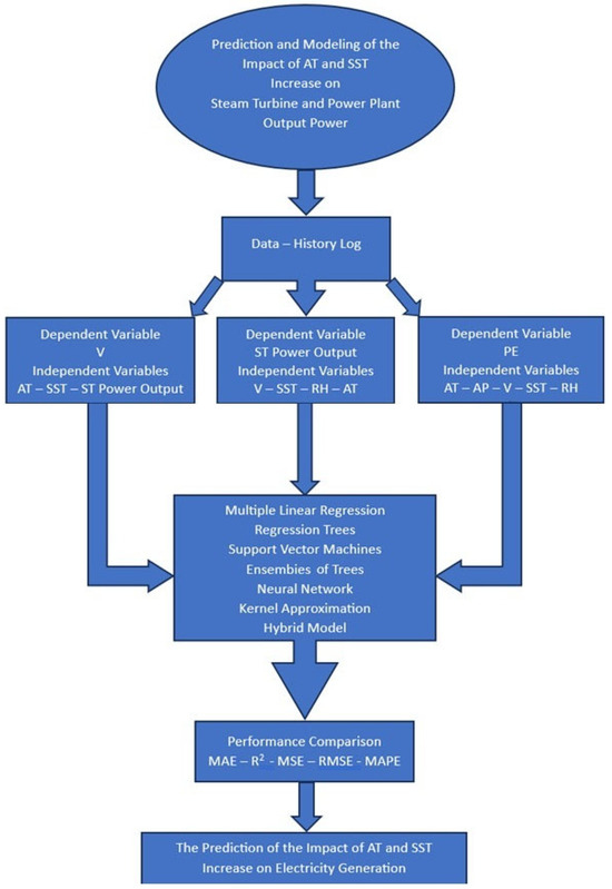 In this study, V, ST Power Output, and PE have been identified as the target variables. Regression analyses were conducted using a dataset of 16,006 h of full-load operation from 2018 to 2024. The flowchart of the research methodology is presented in Figure 2.