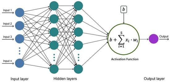 The ANN is a powerful model used in ML. Neural network techniques are widely used because they do not require many parameters for optimization of results [37,38]. An ANN architecture generally consists of three layers: the input layer, hidden layer, and output layer. The weights connecting the neurons in these layers are structures used for storing information in ANN. The number of neurons, the number of layers, and the types of connections between layers play a significant role in the behavior of an ANN [39]. In a simple ANN architecture, there are only input and output layers, and this is called a single-layer ANN. The weighted sum of the inputs and bias values, combined with an aggregation function, is passed through an activation function (such as sigmoid, hyperbolic tangent, linear function, etc.) to obtain the output. When hidden layers are added between the input and output layers, an MLP architecture is formed. Figure 4 shows the ANN structure. MLPs are classified as Feed Forward Neural Networks (FFNNs) and BPNNs [38,40].