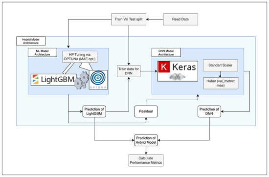 Traditional single-stage models are effective at learning simple and moderately complex relationships, but they may fall short in capturing more intricate patterns and residual errors. These limitations can be mitigated or even completely eliminated by combining the strengths of different methodologies [42]. The two-stage Ensembles of Trees Residual Learning approach proposed in this study aims to overcome this limitation. In the first stage, a powerful and fast machine learning algorithm, LightGBM, generates the base predictions. Then, a Deep Neural Network (DNN) is employed to learn only the residual errors left by these predictions. In this way, the low-bias advantage of LightGBM is preserved, while the DNN contributes by capturing complex variance, ultimately reducing the total prediction error. This architecture is illustrated in Figure 5. In the initial step, the raw data is read and randomly split into training, validation, and test sets. The hyperparameters of the LightGBM model (number of trees, learning rate, number of leaves, and sampling ratios) are optimized using Optuna to minimize the MAE on the validation set. With the optimal parameters selected, the LightGBM model is retrained on the combined training and validation data to produce the base predictions. Subsequently, the residuals are calculated as the difference between the actual values and the LightGBM predictions. These predictions are added to the input matrix as a new feature column. The extended feature set is then standardized using StandardScaler to have a mean of 0 and a variance of 1. The residual learner, implemented as a DNN, consists of four hidden layers with 128, 64, 32, and 16 neurons, respectively. Each layer utilizes ReLU activation, Batch Normalization, and dropout rates of 30% and 20% in successive layers. The model is trained using the Huber loss function, and the validation performance is monitored using the MAE metric. In the testing phase, final hybrid predictions are generated by summing the LightGBM predictions and the residual corrections produced by the DNN. Model performance is evaluated using RMSE, MSE, R2, MAE, and MAPE metrics.