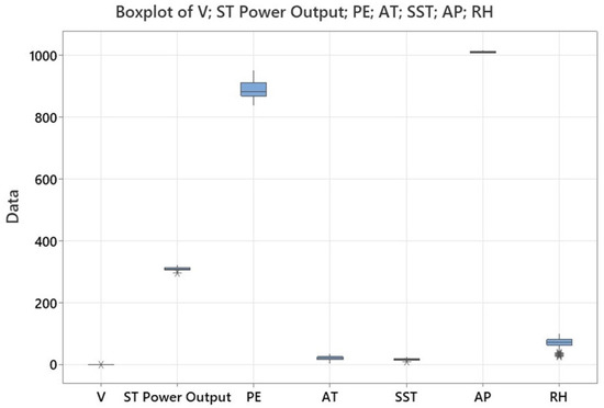 A total of 22,253 real system data records were extracted from the Distributed Control System of the CCPP between 1 February 2018 and 5 September 2024. The plant, with an installed net output capacity of 936 MW, has a design value of 950 MW under base load conditions, including internal consumption. Depending on ambient conditions, the base load PE of the CCPP can be as low as 850 MW in the summer, while in the winter, the PE value exceeds 900 MW. During the summer, the base load PE of the CCPP is 850 MW, while in the winter, this value is considered intermediate load. This demonstrates the significant impact of ambient conditions on the target variables, such as V, ST Output, and PE. Under these conditions, outliers were formed. Additionally, it was checked whether the gas turbines were operating under primary or secondary frequency control in the extracted data. Based on all these criteria, outliers were identified using the box-plot outlier method. After removing the outliers, regression analyses were conducted with 16,006 data points. Figure 6 shows the box-plot graphs representing the outliers for the ambient variables.