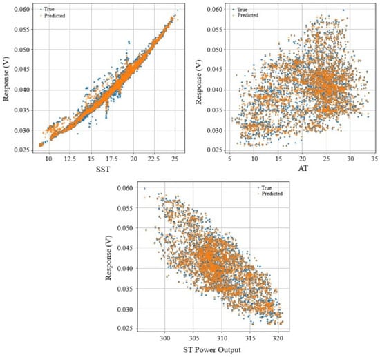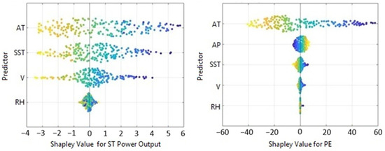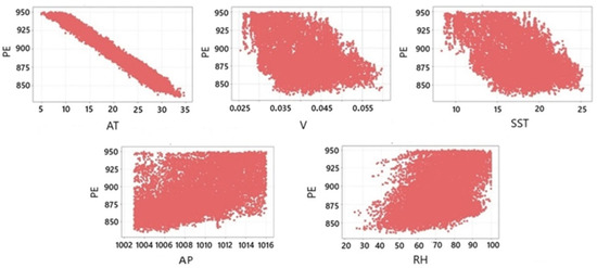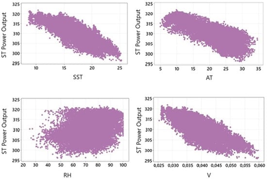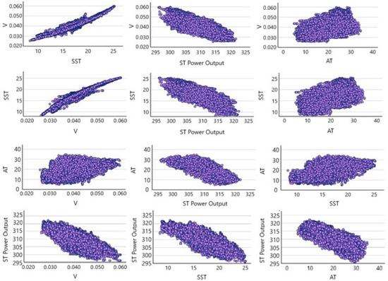 Among the methods for understanding multicollinearity, the correlation matrix is of great importance. Table 2, Table 3 and Table 4 present the correlation matrices showing the relationships between independent variables and the dependent variable. The closer the coefficient between an independent variable and the dependent variable is to 1, the stronger the relationship between the two variables. In Table 2, the value between V and SST is 0.972, indicating a positive effect of SST on V and a very strong linear relationship. In Table 3, the values between ST Power Output and AT, SST, and V are −0.791, −0.788, and −0.739, respectively, indicating that AT, SST, and V have a negative impact on ST Power Output with a relatively high level of correlation. The correlation between RH and ST Power Output is quite weak. In Table 4, the value between PE and AT is −0.985, indicating a negative effect of AT on PE with a very strong linear relationship. The correlations of SST and V with PE are negative and moderate, while the correlation of AP with PE is positive and moderate.