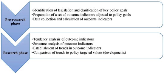 The effectiveness of the municipal waste collection and management policy is assessed by considering the self-prepared guidelines for consistent and logical research (Figure 1). Within them, research is divided into two parts—pre-research and research phases.