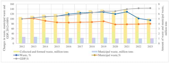 Developments in the amount of waste and municipal waste and volume of GDP from 2012 to 2023 in Lithuania (own estimations based on [43,44]).