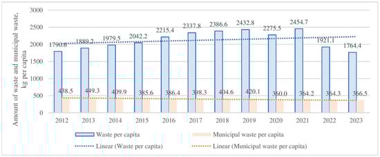 Amounts of waste and municipal waste per capita in Lithuania from 2012 to 2023 (own estimations based on [43,44]).
