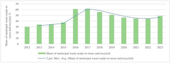 - The results of the analysis focused on the country’s aspiration to increase ready-to-reuse and recycled municipal waste compared to the total amount of collected municipal waste, which showed a challenge and an opposite tendency. Since 2017, the share of ready-to-reuse and recycled municipal waste has decreased. In 2022, it accounted for 44.2%, but this value increased to 49% in 2023.
