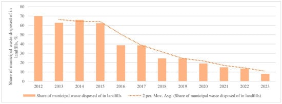 After choosing the “implemented policy” assessment, the data quality, adequacy, and time conditions should be met [42]. Responding to these conditions is not easy; however, we believe that we have considered them since we collected data from official sources and databases. The Lithuanian Statistics [43], the Environmental Protection Agency [44], and the State Waste Collection and Management Plan [21] are the most relevant of these data sources. We chose the most extended possible period—from 2012 to 2023. The period’s beginning and end correspond to the earliest and the latest year for which data are available for comparison.