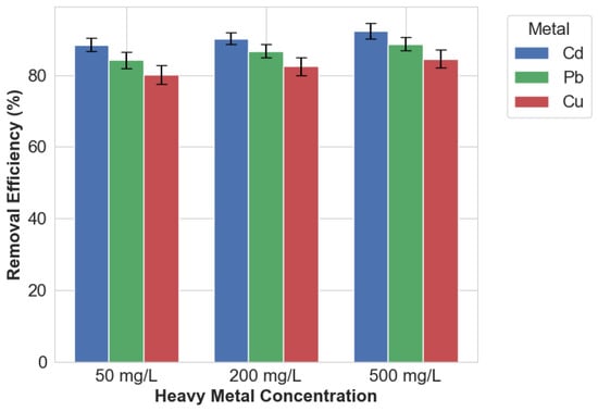 The effectiveness of EICP in stabilizing heavy metals was initially evaluated using aqueous solutions contaminated with single metals—cadmium, lead, or copper—at concentration gradients ranging from environmentally relevant levels (50 mg/L) to industrially significant concentrations (500 mg/L). As shown in Figure 1, the EICP technique exhibited consistently high stabilization performance across all tested conditions, achieving minimum removal efficiencies of 80% regardless of metal type or concentration. Cadmium demonstrated the highest stabilization efficiency, reaching a maximum removal rate of 92.3% at the highest tested concentration of 500 mg/L. Lead and copper showed slightly lower performance, with removal efficiencies of 88.7% and 84.5%, respectively, under comparable conditions. The experimental data revealed an intriguing concentration-dependent trend: treatment efficiency marginally improved as metal concentrations increased. Specifically, for cadmium, the removal efficiency increased from 88.5% at 50 mg/L to 92.3% at 500 mg/L. This observed trend may be attributed to the enhanced local supersaturation at higher metal concentrations, which can promote carbonate precipitation by facilitating heterogeneous nucleation—a mechanism supported by previous studies [21].