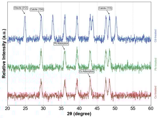 For the ternary metal system containing cadmium, lead, and copper, the removal efficiencies were ranked as Cd > Pb > Cu, with respective values of 76.4%, 68.9%, and 62.1%. This hierarchy aligns with the relative performance observed in single-metal systems but occurs at lower magnitudes due to ionic competition for carbonate nucleation sites. Cadmium exhibited a relatively higher resistance to competitive displacement, which is consistent with its stronger carbonate binding affinity. This finding is corroborated by the persistent detection of otavite (CdCO3) crystallites in XRD analysis (Figure 2), even under competitive conditions.