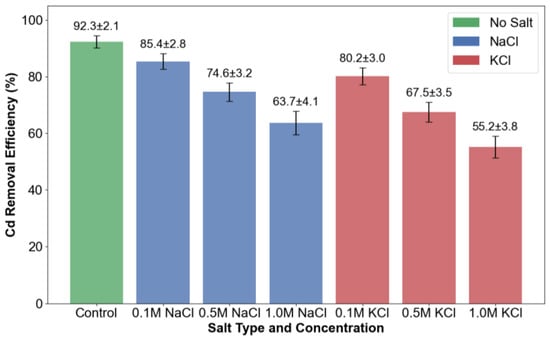 As shown in Figure 4, the concurrent presence of NaCl and KCl significantly suppressed cadmium stabilization, with Cd removal efficiency exhibiting a clear inverse relationship with salt concentration. In systems containing 1.0 M NaCl, cadmium retention decreased to 63.7%, corresponding to a 28.6% reduction relative to the salt-free system (92.3%). Notably, potassium ions demonstrated a more pronounced inhibitory effect compared to sodium ions, as evidenced by the reduced Cd removal efficiency of 55.2% at an equivalent KCl concentration. This suppression mechanism is consistent with the competing cation theory, wherein monovalent cations (Na+/K+) exhibit stronger surface affinity than Cd2+ during calcite nucleation. The preferential adsorption of these alkali metal ions effectively blocks reactive sites on calcium carbonate surfaces, thereby restricting Cd2+ incorporation into the mineral lattice.