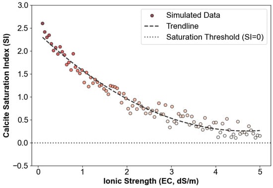 Impact of ionic strength on CaCO3 saturation. The saturation index (SI) was simulated as a function of electrical conductivity (EC). The color gradient of the data points reflects relative SI magnitude for visual clarity and does not indicate distinct experimental conditions.