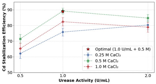 The stabilization efficiency of cadmium was significantly influenced by both urease activity and CaCl2 concentration, as shown in Figure 6. At 0.5 M CaCl2, increasing the urease concentration from 0.5 to 1.0 U/mL improved the stabilization performance from 71.5% to 89.2%. However, further increasing the urease concentration to 2.0 U/mL led to a decrease in efficiency to 84.7%, suggesting the existence of an optimal enzyme activity threshold. This trend was consistent across different CaCl2 concentrations, albeit with varying performance characteristics. For instance, at 0.25 M CaCl2, the maximum stabilization efficiency was 75.8% when paired with 1.0 U/mL urease. In contrast, higher calcium concentrations exhibited diminishing returns; under 1.0 M CaCl2 conditions with the same enzyme loading, the efficiency dropped to 82.4%, possibly due to rapid precipitation kinetics causing soil matrix pore clogging.