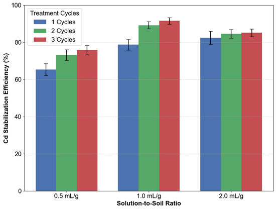 The stabilization efficiency of Cd was significantly influenced by the solution-to-soil ratio and treatment cycles, as shown in Figure 8. For a solution-to-soil ratio of 1.0 mL/g, increasing the number of treatment cycles from one to three enhanced the stabilization efficiency from 78.7% to 91.5%. Specifically, two cycles achieved an efficiency of 89.2%, indicating that the majority of stabilization occurred within the first two applications. In contrast, at a ratio of 2.0 mL/g, additional cycles resulted in diminishing returns; three cycles yielded only 85.1% efficiency compared to 84.6% for two cycles. This suggests that excessive solution volumes (>1.0 mL/g) may saturate soil pores, thereby limiting further carbonate deposition.