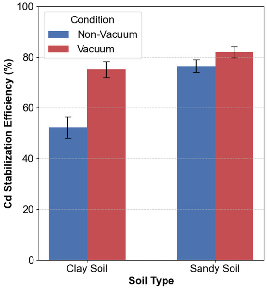 The integration of vacuum-assisted filtration markedly improved stabilization efficiency in low-permeability clay soils but yielded limited additional benefits in sandy soils (Figure 9). For clay soils, the application of vacuum enhanced Cd stabilization efficiency from 52.3% to 75.1%, representing a 22.8% improvement. Conversely, in sandy soils, the increase was only 5.5% under vacuum conditions.