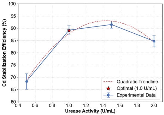 The stabilization efficiency of Cd demonstrated a nonlinear relationship with urease activity, reaching a peak at 1.0 U/mL and subsequently declining at higher concentrations (Figure 10). At 1.0 U/mL, the maximum efficiency of 89.2% was observed, as confirmed by the quadratic trendline, which identified this as the optimal urease activity level. Reducing urease activity to 0.5 U/mL resulted in a 23.5% decrease in efficiency, suggesting that insufficient urea hydrolysis occurred to support effective carbonate precipitation. Notably, efficiency plateaued between 1.0 and 1.5 U/mL, reaching a peak of 91.5% at 1.5 U/mL—a mere 2.3% improvement over the value at 1.0 U/mL. Above 1.5 U/mL, efficiency decreased to 84.7% at 2.0 U/mL, likely due to accelerated urea depletion before complete utilization of Ca2+. This inverse relationship at higher enzyme activities indicates saturation effects, where excessive urease activity surpasses substrate availability.