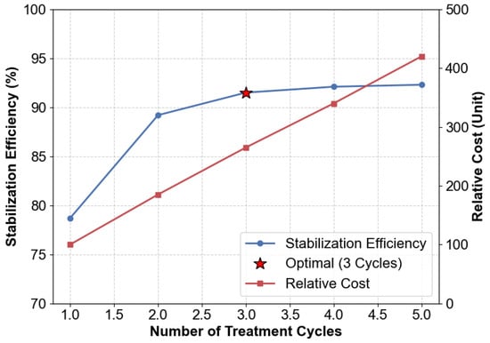 The stabilization performance of Cd exhibited a logarithmic dependence on treatment cycles, as illustrated in Figure 11, with progressively diminishing marginal returns observed beyond three treatment iterations. The initial application achieved a stabilization efficiency of 78.7% with a relative cost expenditure of 100 units. Subsequent optimization through three operational cycles enhanced efficiency to 91.5%, representing a 46% cost increment (265 units) for a measurable 12.8% performance improvement. Further extension to five treatment cycles yielded only limited gains (92.3% efficiency at 420 cost units), revealing that over 95% of the maximal attainable stabilization capacity was achieved within the primary three-cycle operational framework. This saturation pattern suggests an asymptotic approach to maximum stabilization potential, where additional cycles provide minimal practical benefit relative to the substantially increased resource investment.