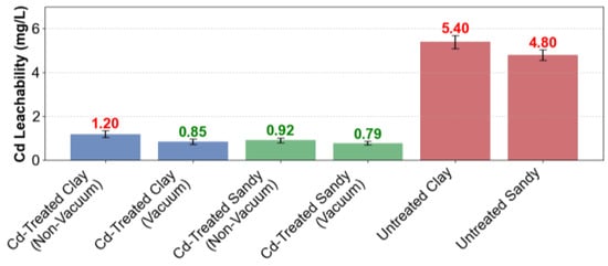 TCLP leachability of stabilized soils. Numerical labels above bars indicate Cd concentrations (mg/L). Red font indicates relatively high leachability, while green font represents lower leachability values for visual comparison.