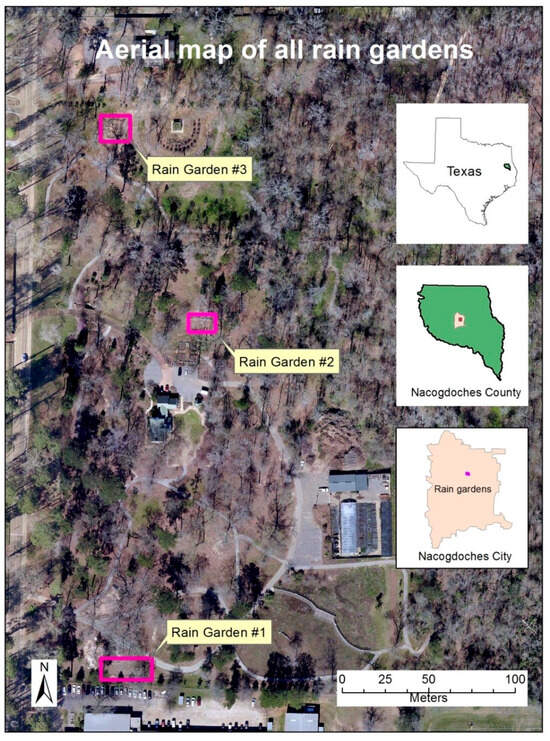 The primary contributing areas to the three rain gardens are upgradient parking lots and building rooftops (Figure 1). Each rain garden was designed to accommodate runoffs from different infrastructure types and varied in size. Rain Garden 1 primarily receives runoff from the Raguet Elementary School parking lot, while Rain Garden 2 is supplied with runoff from the main office parking lot of the PNPC. Rain Garden 3 receives runoff from the Music Preparatory building parking lot at SFASU.