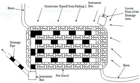 The flow of stormwater through a rain garden treatment system, beginning at the parking lot, serves as the primary source of runoff. The runoff water passed through multiple structures within the rain gardens before reaching the outflow, where treated water was collected for quality analysis. The first component of the system was an instrument box equipped with a Thermo Scientific® 1000 mL HDPE Nalgene® stormwater sampler (Thermo Scientific, Mansfield, TX, USA) and a Hobo® U24-001 temperature and conductivity data logger (Hobo, Bourne, MA, USA). An untreated runoff from the parking lot was first collected in the water sampler inside the instrument box for analysis before entering the rain garden for treatment.