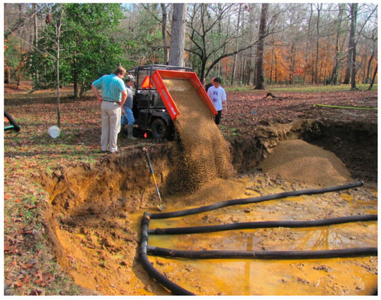The drainage zone, located below the rooting zone, consists of three key layers: filter fabric, gravel, and perforated pipes. The filter fabric separates the rooting and drainage zones, providing additional filtration while acting as a root barrier and preventing organic matter from clogging the drainage system. Below this, a 0.2 m pea gravel bed (Figure 3 and Figure 4) enhances stormwater storage capacity and prevents waterlogging in the upper layers. At the bottom, 0.1 m perforated drainage pipes, spaced 0.9 m apart, facilitate passive gravity drainage. These pipes are connected to a main discharge pipe that directs treated stormwater downgradient.
