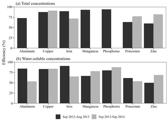 Percentage efficiency calculations for the rain gardens indicated a total copper removal of nearly 90% (Figure 5). Water-soluble copper removal efficiency ranged from 77% to 83% across the three rain gardens. For parameters where outflow concentrations were lower than inflow concentrations, pollutants were generally removed with an efficiency of 50% or higher. The exceptions were water-soluble zinc and potassium, which exhibited lower removal efficiencies. When comparing efficiency percentages from different studies in the literature, copper removal was found to range from 36% to 93% [40]. Phosphorus was removed with an efficiency ranging from 40% to 80%, while zinc was removed with an efficiency ranging from 31% to 99% [41]. Comparing the results from the previous year’s study, boron and fluoride were the only two parameters that were not removed in any rain garden during the first year but were removed in the second year. Copper, which was removed with higher efficiency in all three rain gardens during the second year, was not removed from all rain gardens in the first year.