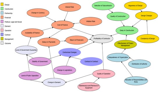In BBN, nodes represent critical risk factors affecting profitability in PPP hospital projects during the investment planning (project appraisal) phase, and these nodes are interconnected by arcs that define the relationships between the factors. Expert Elicitation Session-2, which used the findings from the previous session, provided useful information for finalizing the model structure. For instance, during this session, various questions were posed to explore the interrelations between factors, such as “How do government guarantees influence the availability of financing for PPP hospital projects?” Figure 2 illustrates the main structure of the BBN model.